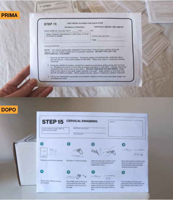 Il kit è stato riprogettato sotto vari aspetti: le istruzioni sono state semplificate e ridisegnate in stile IKEA, in modo da ridurre il carico cognitivo di infermiere e dottori e da accorciare i tempi della visita.