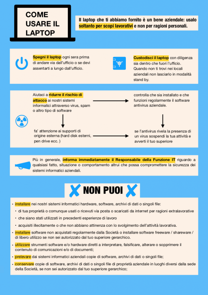 Partendo da questo scenario con un cliente abbiamo deciso di ripensare l’intera esperienza legata alla documentazione in materia di privacy, a cominciare proprio dal regolamento sull’uso dei sistemi informatici aziendali.