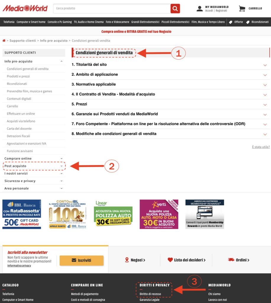 In questo esempio tratto dal sito di Mediaworld, le informazioni sul reso non sono contenute nelle condizioni generali di vendita (1), le quali si limitano a rimandare ad una sezione “Diritti e Garanzie” che non esiste.