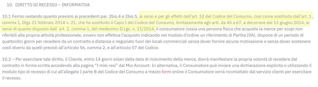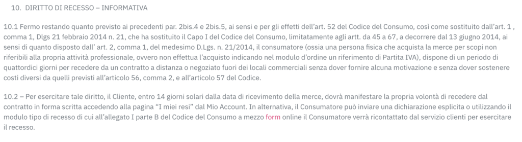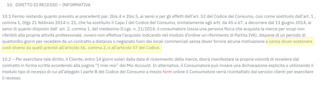 Il cliente, per capire quali siano i costi da sostenere per il reso, è costretto a leggersi per conto suo due (lunghi e complessi) articoli del codice del consumo.